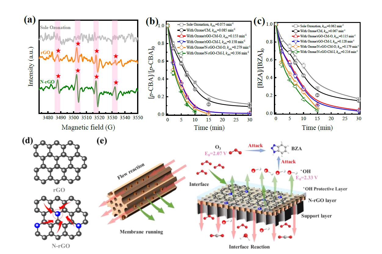在此,为了研究界面特性对N-rGO-CM-I催化活性和自清洁性能的影响机制,建立了多个线性关系。当增加上述三种界面特性(厚度、粗糙度和疏水性)时,p-CBA和BZA的kobs值几乎呈线性改善,表明它们对界面催化活性有贡献。在N-rGO-CM中,较厚的催化层引入了更复杂的电子态和共价碳体系的自旋特征,导致•OH的富集(p-CBA的去除结果很好地说明了这一点)。此外,粗糙度的增加表明表面具有更多暴露的活性中心,如掺杂-N,这有助于提高催化活性。因此,厚度和粗糙度对N-rGO-CM-I的催化活性的调节具有协同作用。此外,更疏水的N-rGO-CM-I表面有利于p-CBA或BZA吸附,界面吸附缩短了目标分子与氧化剂之间的距离,从而提高了催化活性。