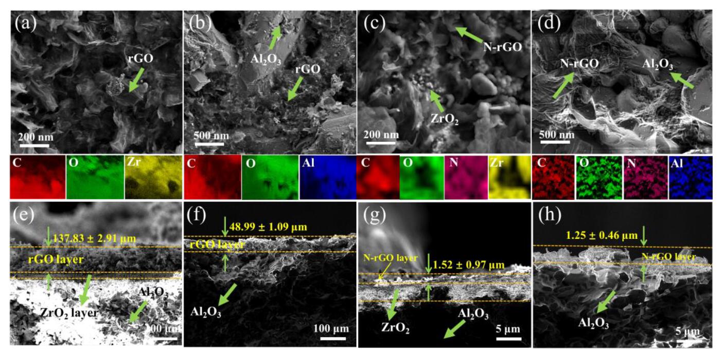 如图6所示。由于N-rGO被均匀锚定在陶瓷膜表面,形成均匀的高性能活性中心。使得N-rGO-CM-I在微污染物去除和膜自清洁方面表现出优异的稳定性。N-rGO-CM-I在使用18次之后,依然保持较高的自洁性能和BZA去除性能。用水反冲洗后,N-rGO-CM-I的水通量恢复到初始水通量的97%,在接下来的过滤周期提供了高的水通量。反洗过程中活性中心吸附的降解产物被去除,反洗后对微污染物的催化活性大部分恢复。此外,催化层与CM之间的牢固程度也是不容忽视的。如下图中的SEM表征结果,清晰地观察到N-rGO牢固地负载在CM表面,经过多次使用之后,催化层厚度没有明显的变化。这使得N-rGO-CM-I在微污染物去除和膜自清洁方面表现出稳定有效的协同性能,表明其在可持续地处理废水过程中对于污染物去除方面的实用性,并且在这个过程中,有毒副产物的形成得到了有效地缓解。