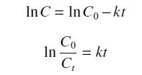 式中:r 为反应动力学速率;C 为抗生素浓度,mg·L−1;t 为反应时间,min;k 为反应速率常数,min−1;基于初始变量 t=0,C=C0,分离变量、积分,则得一级反应动力学方程 (如式 (2) 和式 (3) 所示)。