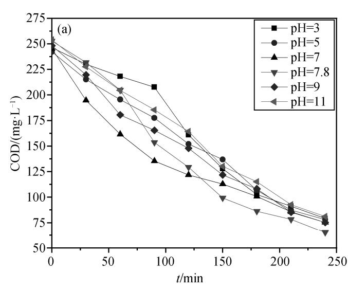 在催化剂投加量为 30%, 香蕉视频下载流量为 3 L/min的条件下, 设置废水初始 pH 分别为 3, 5, 7, 7.8 (不调 pH), 9 和 11, 探讨废水初始 pH 对催化香蕉视频下载化降解效果的影响, 结果如图所示。