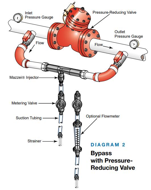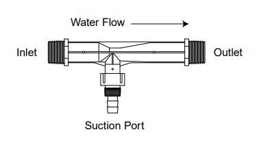 •Mazzei射流器需要压差才能产生吸力。喷油器的出口压力(背压)必须充分低于进口压力。对于大多数型号,吸力从25-30%的压差开始。为了确保吸力一致,喷射器的出口侧应充满水或下游有一些阻力(背压)。