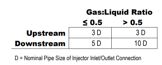 3.Mazzei建议在注射器的上游和下游安装一条与注射器直径相同的直管。关于射流器和阀门之间的最小互连管道长度要求、管道膨胀或方向变化,请参阅下表。